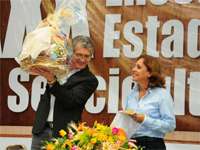 A programação pelos 57 anos de Terra Boa incluiu a sediação do 30º Encontro Estadual de Sericicultores. O evento lotou o ginásio de esportes, com mais de 1,5 mil produtores de 216 municípios presentes. Quem também prestigiou o encontrou foi o secretário de Estado Norberto Ortigara (Agricultura). Olha ele aí, recebendo um cesta de produtos da prefeita Vera Zanatta. E teve até levantamento de cesta, hein?...