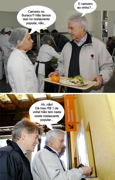 ENQUANTO ISSO, NO RESTAURANTE POPULAR... Os cliques são de Curitiba, onde o deputado federal Rubens Bueno aproveitou a campanha para vice-prefeito para almoçar num dos restaurantes populares mantidos pela prefeitura. Segundo ele, a qualidade da comida é impressionante. E tudo por R$ 1. Só não tem os pratos típicos da região. Ah, mas nem o pirão do carneiro no buraco?...
