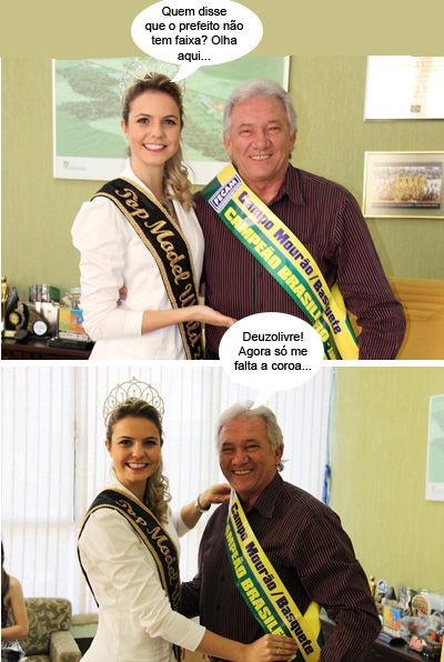 Boca Santa mostrou ontem que o prefeito Nelson Tureck era o único “sem faixa” na foto feita durante a visita de sete misses e de um mister eleitos no mês passado em Campo Mourão. Mas ele não ficou sem faixa, não. Como no gabinete tem a faixa do basquete-m mourãoense, campeão dos Jogos Abertos Brasileiros, Tureck usou ela mesmo, com a ajuda da miss Campo Mourão 2011, Glória Maria Rossi. Ah, tá pensando o quê!...