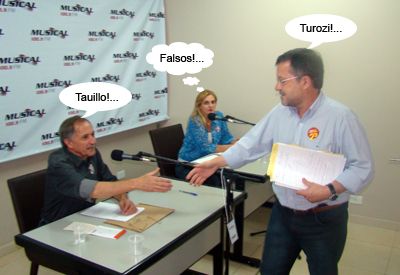O clic é deste sábado, no primeiro debate entre os prefeitáveis de Campo Mourão, promovido pela rádio Musical FM. A ordem nas mesas foi definida em sorteio. Regina Dubay (PR) entrou primeiro no estúdio. Depois veio José Turozi (PV). Tauillo Tezelli (PPS) entrou por último e cumprimentou os dois primeiros. O debate foi bem tranqüilo. Teve hora que deu até um sooooooono...