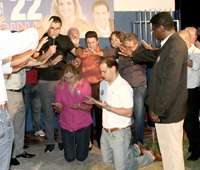 A prefeitável Regina Dubay lançou ontem à tarde, em seu comitê, a Frente Cristã Evangélica. Teve oração e tudo. Olha Regina e o candidato a vice, Rodrigo Salvadori, de joelho durante o lançamento. A frente é presidida pelo pastor Valdir Modesto, da 5ª Igreja do Evangelho Quadrangular. Sabe como é que é, a pastora Jurema, da 1º IEQ, é candidata a vice-prefeita de Tauillo Tezelli (PPS), tem que contra-atacar, né?...