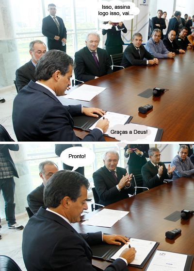 Os clique são da semana passada, em Curitiba, quando o governador Beto Richa assinou, enfim, a municipalização do trânsito em Campo Mourão. Repare que o prefeito Nelson Tureck parece juntar as mãos em agradecimento divino pelo ato. Pudera. Fazia é tempo que a municipalização tava emperrada nessa assinatura. E agora vai, né?...