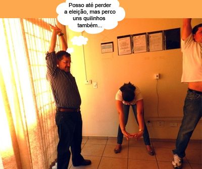ENQUANTO ISSO, NA CAMPANHA ELEITORAL... O clic é da campanha eleitoral em Camp Mourão. O candidato a prefeito Tauillo Tezelli foi fazer uma visita à empresa Saubern Médica e chegou bem na hora da ginástica laboral. Daí, não teve jeito. Teve que participar dos exercícios ao lado de diretores e funcionário da empresa. A foto saiu no site do prefeitável. Ah, pensa que é só cafezinho, é?...