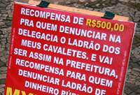O candidato a vereador Mykymias segue com a estratégia de chamar a atenção com cavaletes diferentes. Primeiro escreveu que não tinha dinheiro para por sua foto neles. Depois provocou, pedindo que o eleitor não de deixasse levar por um sorriso bonito. Os cavaletes acabaram roubados. Agora colocou outro oferecendo R$ 500 de recompensa a quem denunciar “o ladrão” na delegacia. Hummmmm...