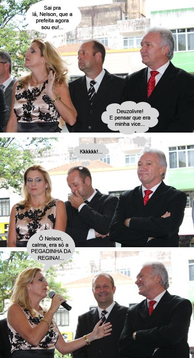 Em outro trecho, ela fez referência à eleição de Pedrinho Nespolo (PPS) como presidente da Câmara. “Independente de sigla partidária, sei que o Pedrinho ama nossa cidade”, ressaltou. “Juntos venceremos”, completou. Em seguida, Regina lembrou que apoiou no passado atuais adversários políticos. “Anos atrás estivemos juntos com o Tauillo Tezelli e o Rubens Bueno”, se referindo às eleições de 1992 e 1996. Ô pezinho quente, hein?...