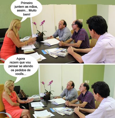 A prefeita Regina Dubay recebeu a primeira visita de vereadores em seu gabinete (a transmissão de cargo não conta, né?). Foram dois “nobres edis” do PR (partido da prefeita) – Olivino Custódio e Toninho Machado – e o independente Luiz Alfredo (PT do B). O trio levou uma pauta de reivindicações para esse início de mandato. Tudo para agilizar os trabalhos da prefeitura. E tudo na maior paz e amor. Mais um pouco e dá prêmio Nobel...