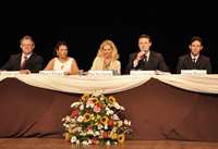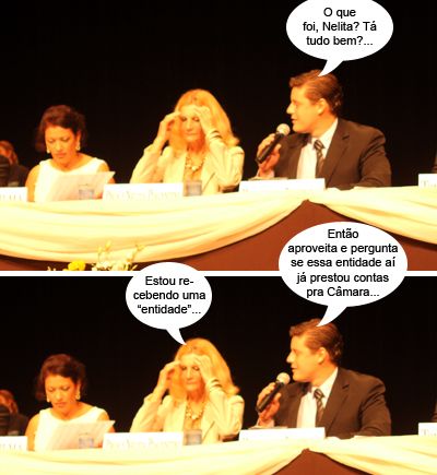 Os cliques são da sessão de posse da Câmara, quando o presidente Pedrinho Nespolo já discursa após ser eleito. Ao seu lado aparecem as vereadoras Professora Vilma (1ª secretária) e Nelita Piacentini (1ª vice-presidente). Detalhe: o currículo de Nelita inclui uma pós-graduação em parapsicologia.