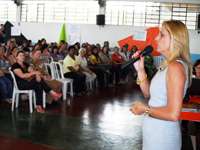 Olha aí a prefeita eleita Regina Dubay discursando durante do 4º Encontro das Mulheres que Lutam e Sonham, em Guarapuava. Ela foi convidada pela vereadora e vice-prefeita eleita de lá, Eva Schran. Regina falou sobre a criação da Secretaria da Mulher em Campo Mourão, pasta que, desde o início de 2005, só deixou para disputar as eleições de 2008 e deste ano. Olha aí, dá pra dizer que a secretaria dá sorte...