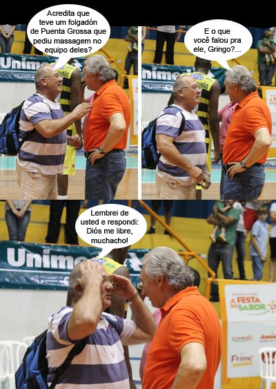 ENQUANTO ISSO, NA DECISÃO DO BASQUETE... Os cliques são no ginásio JK, após a vitória de Campo Mourão sobre Ponta Grossa, que deu o tricampeonato estadual de basquete-m aos mourãoenses. O prefeito Nelson Tureck e o massagista Nestor Gringo, o “mais mourãoense dos uruguaios”, aproveitaram pra colocar a conversa em dia.