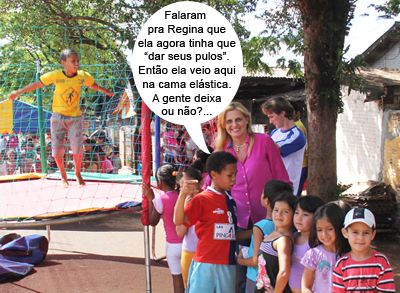 ENQUANTO ISSO, NO DIA DAS CRIANÇAS... O clic foi feito domingo, quando a prefeita eleita Regina Dubay foi ao conjunto Mendes, onde aconteceu o “Domingo recreativo nos bairros”, promovido pela Fundação de Esportes. O evento comemorou a passagem do Dia das Crianças. Em tempo: Regina, que tem que dar seus pulos pra cumprir as promessas de campanha, não usou a cama elástica, tá?
