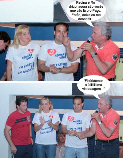 Hoje tem mais cliques da festa da vitória da prefeita eleita Regina Dubay, que aconteceu no início da noite de domingo passado, após a contagem oficial definir quem venceu a eleição em Campo Mourão. Como dá pra ver, o prefeito Nelson Tureck esteve por lá e fez um discurso inflamado ao lado de Regina e de seu vice, Rodrigo Salvadori. E nem era o “Chico Mineiro”, hein?...