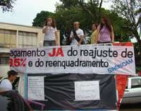 O movimento grevista levou cerca de 200 servidores para a frente da prefeitura. A maioria são professoras. Muito pouco são homens. Dá pra contar nos dedos os grevistas masculinos. Não faltaram faixas com protestos bem humorados ou provocativos. Teve quem escrevesse o “3,5%” numa sacolinha da Tim. Ou quem frisasse que não quer tchu, nem tcha, mas os “3,5% já, já, já”! E nada de “Chico Mineiro”, o servidor que dinheiro...