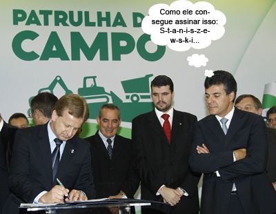 O clic é de segunda-feira, em Curitiba, quando o governador Beto Richa fez o lançamento oficial do programa “Patrulha do campo”. Vários prefeitos da região estiveram por lá. O convênio também foi assinado pelo presidente da Codapar, o mourãoense Tino Staniszewski. E assinado sob a observação atenta do governador, hein?...