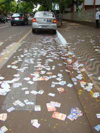 Diferente das últimas eleições, a maioria das ruas em frente às seções eleitorais de Campo Mourão amanheceu cheia de santinhos. A foto é em frente ao colégio Integrado, mas a sujeira é ainda maior em outros locais de votação, principalmente na perifeira.