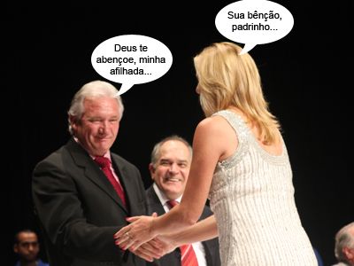 ENQUANTO ISSO, NA DIPLOMAÇÃO DOS ELEITOS... O clic é da solenidade de diplomação dos eleitos na comarca de Campo Mourão, realizada nesta terça-feira à noite no Teatro Municipal. Após discursar em nome dos prefeitos eleitos, Regina Dubay cumprimentou todos na mesa principal, para alegria do prefeito Nelson Tureck. O presidente da OAB, Júlio Queiroga, aparece ao fundo.
