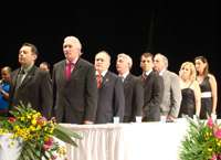 A solenidade de diplomação lotou o Teatro Municipal, que voltou a ser utilizado, mas ainda não está com as reformas concluídas, não. “Este teatro, que já viu tantos espetáculos, hoje vê o espetáculo da democracia”, destacou a promotora Rosana Araújo de Sá Ribeiro Pereira. O prefeito Nelson Tureck só lamenta que não vai conseguir inaugurar as reformas. Ficará pra Regina Dubay. Viu, não são só contas pra pagar...