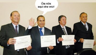 O clic é de Goioerê, onde aconteceu ontem a diplomação dos prefeitos e vereadores eleitos na comarca goioerense. Detalhe: nenhum é marinheiro de primeira viagem. Luiz Volpato (Moreira Sales) E Beto Costa (Goioerê) foram reeleitos. Valdinei Peloi (Rancho Alegre do Oeste) foi reeleito para o quarto mandato. Reinaldo Krachinski (Quarto Centenário) está de volta após perder a eleição anterior. Portanto, nada de novo no front...
