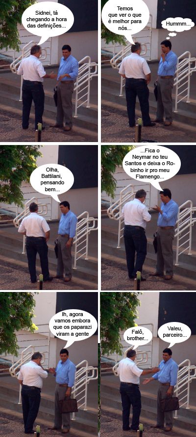 O vereador eleito Edson Battilani e o pentaeleito Sidnei Jardim, ambos do PPS, nem imaginavam, mas estavam sendo acompanhados por um paparazzi quando confabulavam no calçadão, em frente ao HSBC. E não era de futebol que eles estavam falando, era?...