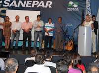 Oito prefeitos da região participaram, quarta-feira, da solenidade em Campo Mourão que comemorou os 50 anos da Sanepar. Foi no Senac, com direito a mensagem do governador Beto Richa exibida em telão. O evento também teve a participação de seis vereadores mourãoenses. No discurso, a prefeita Regina Dubay lembrou da chegada da água tratada em Campo Mourão, em 1978. Antes era tudo na base do poço mesmo...