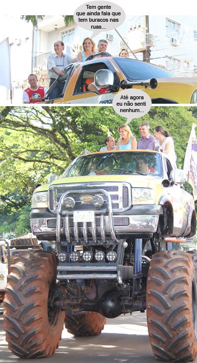 Mais de 50 jipes que participam do 19º Rally Transparaná Troller 2013 passaram nesta terça-feira por Campo Mourão. A chegada à cidade incluiu um desfile com a prefeita Regina Dubay. Tudo em cima de uma camionetona big foot (pé grande). Os vereadores Edilson Martins e Olivino Custódio e a secretária Karla Tureck (Educação) também curtiram o passeio nas alturas.