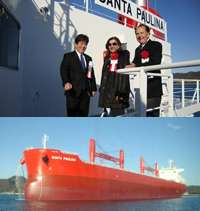 Lembra que foi divulgado que o presidente da Coamo, Aroldo Gallassini, iria ao Japão batizar um navio? Como a gente mata a cobra e mata a bicha morta, olha Gallassini aí na hora do batismo do naviozão. O navio é alemão, o batismo foi no Japão e o padrinho é brasileiro. O nome da embarcação também é tupiniquim – “Santa Paulina” -, por sugestão de Gallassini. E viva o mundo globalizado!...