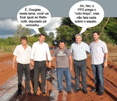 ENQUANTO ISSO, NA ESTRADA DE MAMBORÊ... O clic é de Mamborê, onde o prefeito Nei Calori e o deputado Douglas Fabrício foram ver a situação dos 17 quilômetros da PR-553, entre Mamborê e Pranchinha. Os vereadores Silvio Silveira, Juliano Sehaber e Gumercindo dos Santos acompanharam. E haja Nugget pra esses sapatinhos, hein?...