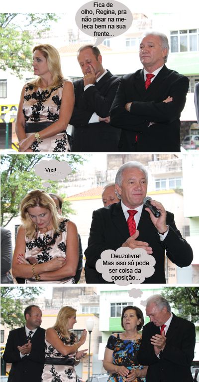 Duas semanas depois da posse, ainda tem foto rendendo balãozinho. Nos cliques acima, estão a prefeita Regina Dubay, o “primeiro-damo” Laércio Dubay, o ex-prefeito Nelson Tureck e a ex-primeira-dama Rita Tureck. E o que eles tanto olhavam pra baixo? Mistéééériio...