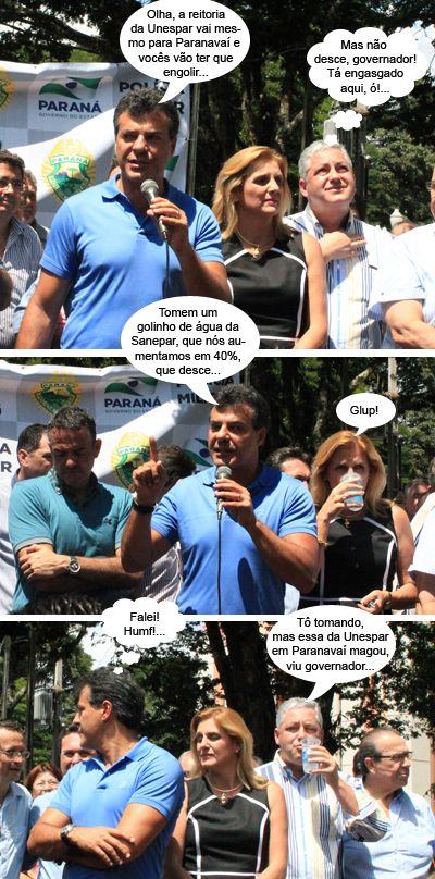 O anúncio de que a reitoria da Unespar ficará em Paranavaí foi feito pelo próprio governador, que esteve sexta-feira por lá para outro evento. Segundo o colunista Saul Bogoni, Beto Richa manifestou preocupação com eventuais broncas dos mourãeonses. “Agora vocês têm que me defender de possíveis críticas dos seus colegas”, disse o governador aos quatro deputados presentes em Paranavaí. Ah, pra quem tem apoio de 50 deputados...