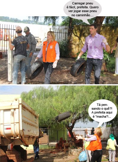 Os cliques são deste sábado, durante mais um arrastão de combate ao mosquito da dengue. A prefeita Regina Dubay mais uma vez participou e botou a mão no lixo. O diretor da Secretaria de Agricultura e Meio Ambiente é quem aparece ao lado dela carregando pneu.