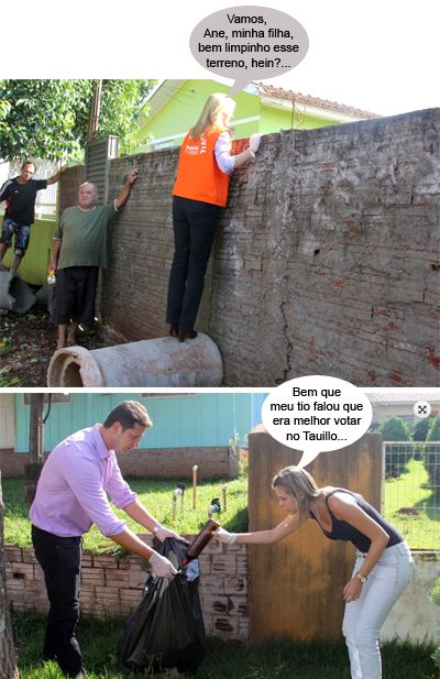 ENQUANTO ISSO, NO COMBATE À DENGUE... Os cliques são do arrastão e combate ao mosquito da dengue realizado neste fim de semana. A prefeita Regina Dubay participou com direito a espiadinha em terreno baldio murado. A secretária-filha Anelise Dubay (Mulher) e o diretor Adriano Camargo (Meio Ambiente) também saíram a cata de lixo. Ah, os “embalos” de sábado...