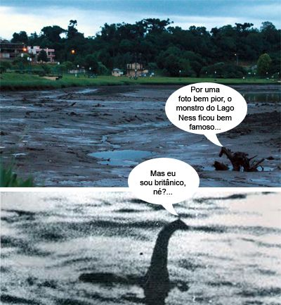 ENQUANTO ISSO, NA PARQUE DO LAGO... O clic é do Parque do Lago, em Campo Mourão, que teve o lago esvaziado para o início dos trabalhos de desassoreamento. Agora, cá pra nós: o que é aquilo que aparece ali no canto? É o “monstrinho do Parque do Lago”. Ah, se o lago Ness, na Escócio, pooooode...