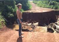 Em Farol, a prefeita Angela Kraus aproveitou o fim de semana pra dar uma conferida na zona rural. Foi ver a situação das estradas. E olha só o que ela encontrou pelo caminho! Angela explicou aos moradores que precisa de uma “trégua” de São Pedro pra fazer as melhorias. O orçamento está pronto, falta a estiagem. No mais, como diria o poeta, tem um buracão no meio do caminho, no meio do caminho tem um buracão...